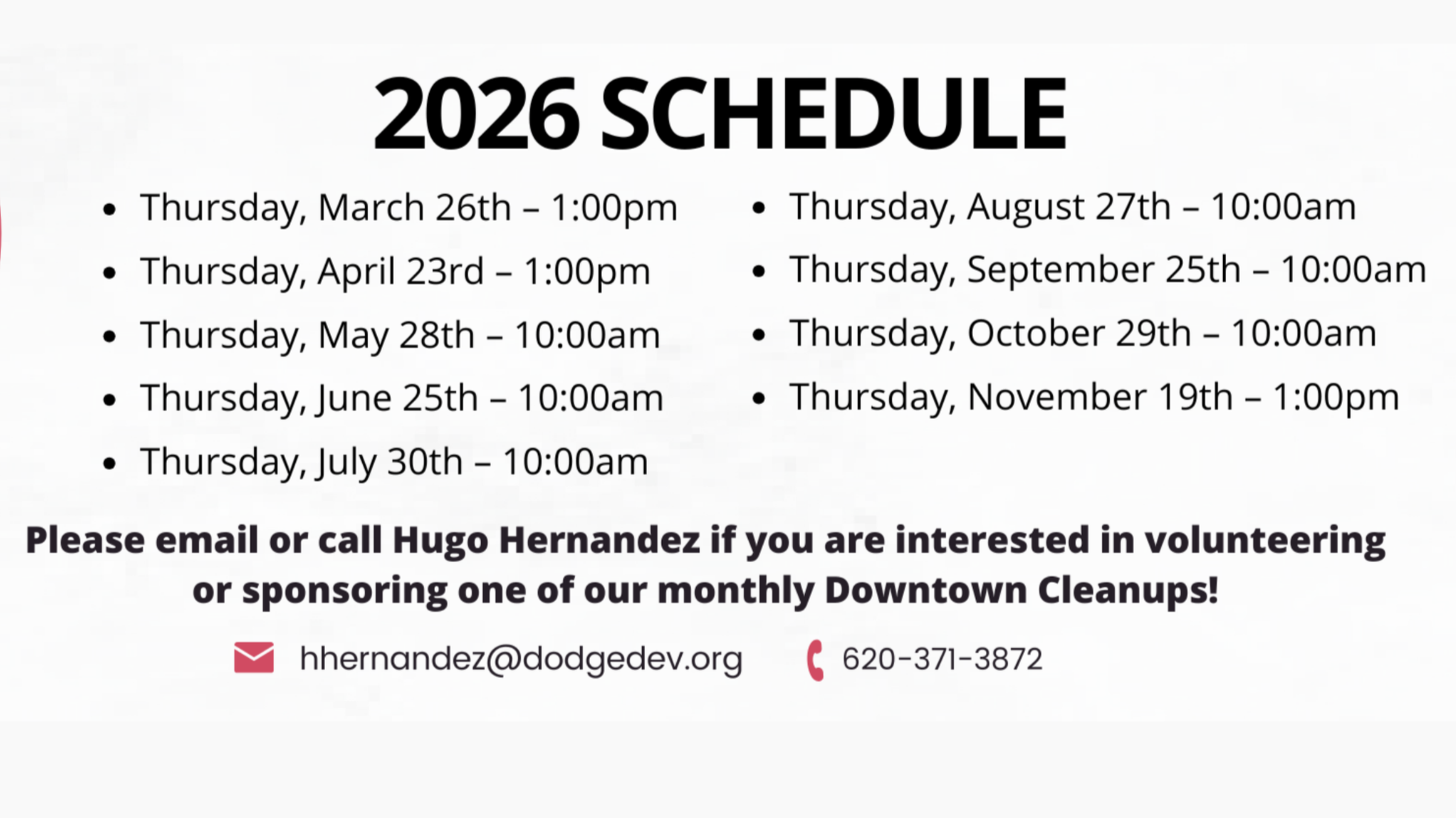 Main Street Dodge City is always looking for businesses, organizations, and individuals who want to make a positive impact through our monthly Downtown Cleanups. Whether you’re able to roll up your sleeves and volunteer your time, or support the effort through financial or in-kind donations (like providing refreshments for our hardworking volunteers), every contribution makes a difference.